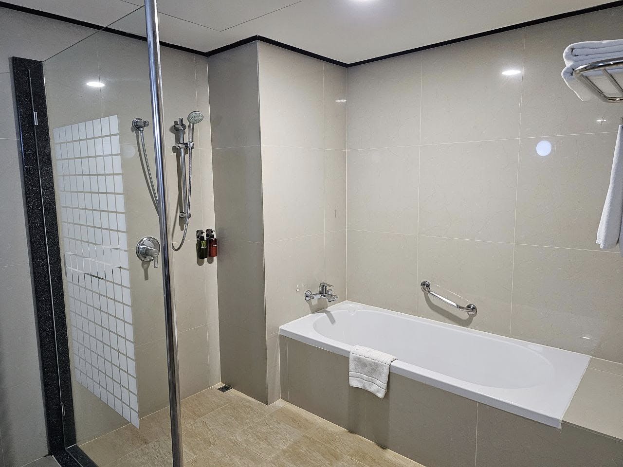 Deluxe room with pool view, a spacious 30 sqm. room with a king-size bed (6 ft.). The bedroom comes with a sofa, TV, mini fridge and an en-suite bathroom with a separate shower and bathtub. The room has a modern design with a rustic twist that will enhance your feeling of comfort and relaxation.