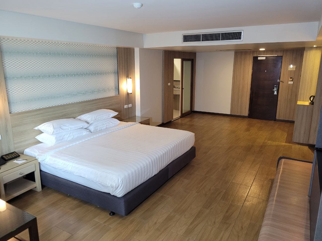 Grande Deluxe Suite room, a spacious 34 sqm. room with a super king-sized bed (7 ft). The room comes with a sofa, TV, mini fridge and an en-suite bathroom with a separate shower and bathtub. The room has a modern design with a rustic twist that will enhance your feeling of comfort and relaxation.