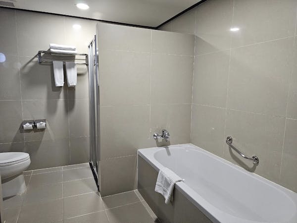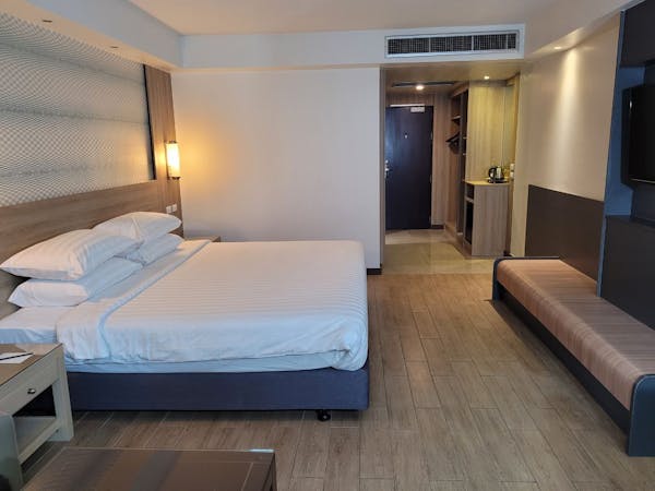 Grande Deluxe Suite room, a spacious 34 sqm. room with a super king-sized bed (7 ft). The room comes with a sofa, TV, mini fridge and an en-suite bathroom with a separate shower and bathtub. The room has a modern design with a rustic twist that will enhance your feeling of comfort and relaxation.